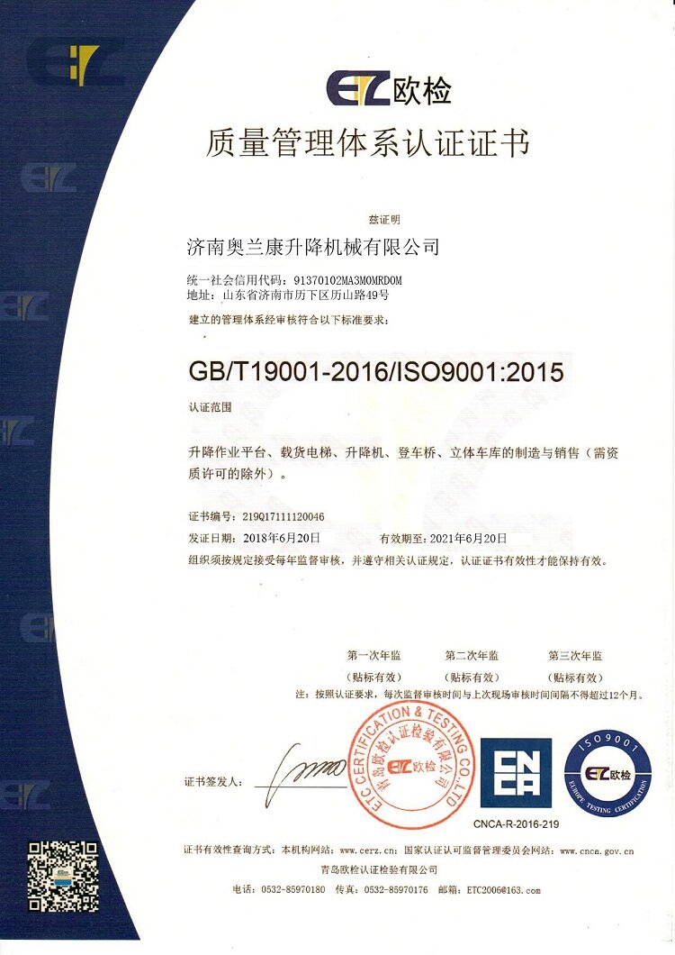 濟(jì)南奧蘭康升降機(jī)械有限公司位于液壓升降平臺(tái)生產(chǎn)基地山東濟(jì)陽,是設(shè)計(jì)和制造液壓升降平臺(tái)、高空作業(yè)平臺(tái)、液壓貨梯及其他液壓升降設(shè)備的企業(yè),多年來致力于為用戶提供可靠的升降設(shè)備產(chǎn)品。 公司產(chǎn)品目前已經(jīng)遍布企業(yè)車間、高速公路、機(jī)場、港口、智能倉儲(chǔ)等領(lǐng)域。大眾創(chuàng)業(yè),萬眾創(chuàng)新,奧蘭康優(yōu)秀的研發(fā)施工團(tuán)隊(duì)全心全意為客戶量身打造、提供更佳的產(chǎn)品設(shè)計(jì)、技術(shù)支持、工業(yè)產(chǎn)品?!澳嵋粋€(gè)需求,還您一個(gè)滿意產(chǎn)品”,奧蘭康希望能助您的事業(yè)更高、更遠(yuǎn)、更強(qiáng)!